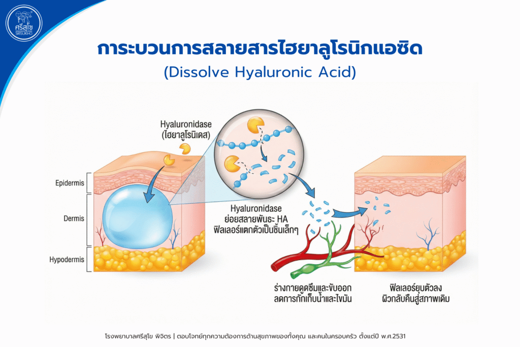 ในปัจจุบันมีสารที่สามารถใช้สลายไฮยาลูโรนิกแอซิดได้ เรียกว่า “ไฮยาลูโรนิเดส” (Hyaluronidase) ซึ่งแพทย์จะใช้ในการแก้ไขกรณีที่ได้รับสารมากเกินไป หรือเกิดภาวะแทรกซ้อนจากการอุดตันของหลอดเลือด เพื่อให้เนื้อเยื่อกลับมาสู่สภาวะปกติ แต่การใช้สารในการสลายต้องผ่านการตรวจ/ประเมินโดยแพทย์อย่างละเอียด ไม่สามารถซื้อหรือดำเนินการนอกเหนือการควบคุมดูแลจากแพทย์